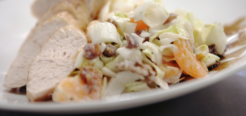 Witlof geeft een minder bittere smaak af wanneer het hart van de witlof wordt weggesneden. Snij hiervoor de witlofstronkjes in de lengte door en verwijder het bittere hart voordat je het ragfijn snijdt. Kalkoenfilet bevat meer eiwitten en minder vetten in vergelijking met kipfilet.
