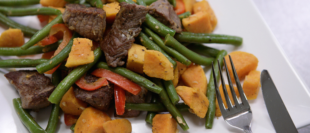Smakelijk sportief: runderbiefrepen met zoete bataat en boontjes