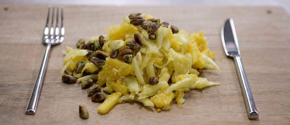 - Bak de pistachenootjes in een droge wok tot ze iets bruin kleuren en strooi ze over de venkelsalade.