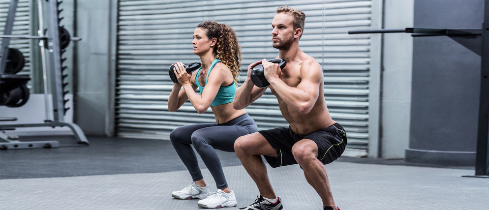 Ga in squathouding staan met je voeten iets wijder uit elkaar dan je heupen. Houd de kettlebell tegen je borst gedrukt. Kantel je bekken een klein stukje naar achteren en buig door je knieën. Doe tien squats, waarbij je rug recht blijft. (Zie de foto op deze pagina.)
