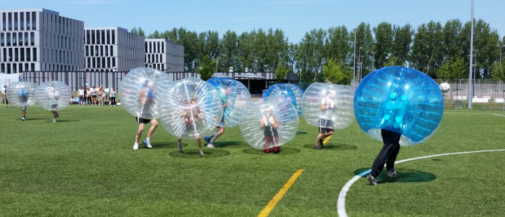 Bubbelvoetbal is voetbal zoals je dat normaal speelt, met één groot verschil: als speler draag je een grote opblaasbal om je bovenlichaam. En dat maakt het trappen van de bal of het maken van een flitsende actie toch een heel stuk lastiger.