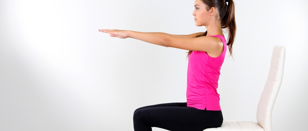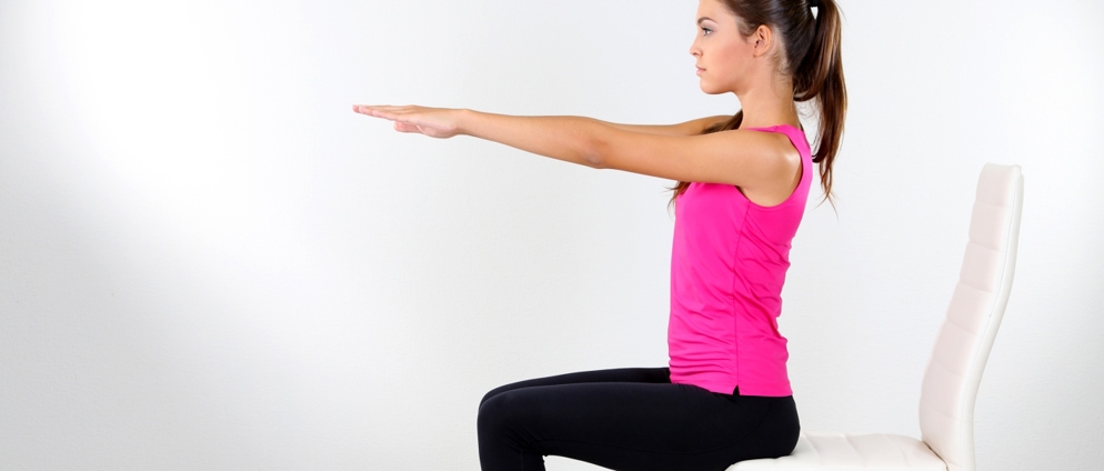 Deze oefening kun je doen waar je maar wilt. Ga op een stoel zitten met je armen voor je op schouderhoogte. Bal je handen tot vuisten en laat ze elkaar voor je borst raken, terwijl je ellebogen naar buiten wijzen. Open nu je borst door je ellebogen zo ver naar achteren te bewegen als je kunt. Ook je handen bewegen mee. Daarna beweeg je weer naar voren. Stop nu niet op het punt waar je handen elkaar weer raken, maar beweeg ze nog wat verder naar je schouders toe. Buig je hoofd voorover in de driehoek die je ellebogen hierbij maken.