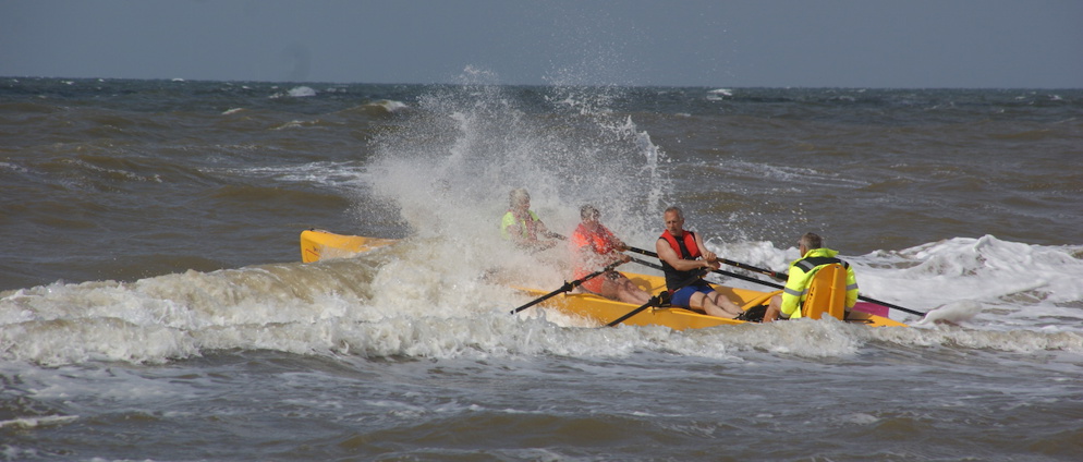 Een avontuurlijke variant op het ‘gewone’ roeien, dat is Coastal Rowing, een sport die wordt beoefend op groot open water. “In andere landen, zoals Frankrijk, Italië en Australië, wordt deze tak van sport (bij gebrek aan rivieren) veel op zee beoefend”, vertelt Guus. “Doordat je veel verder van de kant af roeit en op veel dieper water bent, krijg je te maken met veel grotere golven dan wanneer je op een kanaal roeit. Het kan bijvoorbeeld gebeuren dat de golven aan de ene kant een meter boven de boot uitsteken en aan de andere kant een meter eronder. Je krijgt heel wat water over je heen. De boot wordt Yole de Mer genoemd en heeft een gesloten zelflozende structuur. Je hoeft niet bang te zijn dat hij volloopt.”